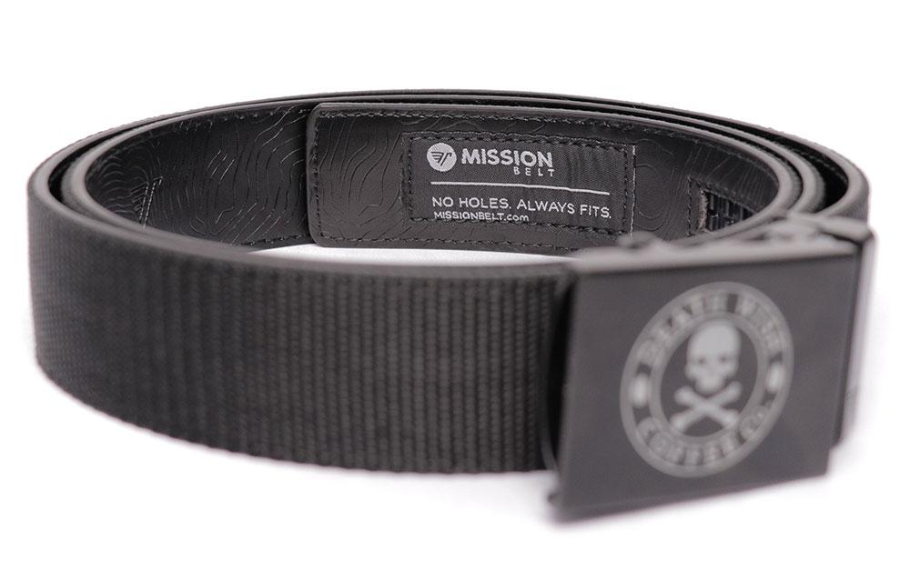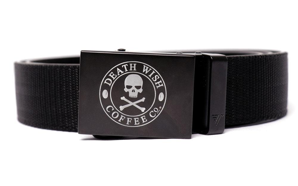 - Belt is all back and includes engraved Death Wish Coffee skull and crossbones logo